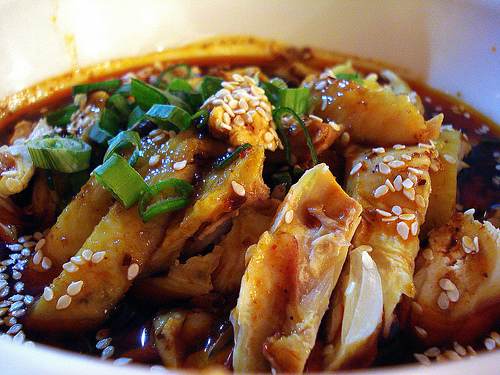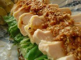 火を通した鶏肉を一口サイズに切り、胡麻の香りが濃厚で、さっぱりとした蒸し鶏にピリッと辛くて香り豊かな胡麻タレがベスト、マーチ、口当たりもよく弾力があり、シャキシャキとする感じ、前菜として、ピールと非常に合います